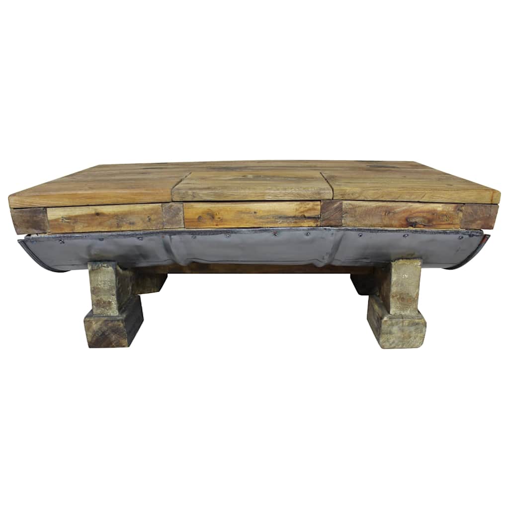 This retro-style wooden coffee table will be a great choice for adding a rustic touch to your home decor. The table top and the legs are made of solid reclaimed wood, which has the characteristics of different woods like mahogany, teak, mango wood, acacia, etc. The recycled barrel made of galvanised iron adds to the table's sturdiness and its rugged, industrial style. You may find cavities left by nails, screws, or bolts, along with other imperfections, underlying the authenticity of the material. These imperfections disclose a rich history and are never intentionally made. The wood originates from naturally fallen trees, wooden boats, wooden houses, etc. Every piece is unique and slightly different from the next. Signs of wear and the craftsmanship of this fully-handmade table give each piece a unique look and add to its spectacular vintage style. Every step of the process is carried out with the greatest care. Assembly is easy. Important note: The colours may vary from piece to piece, making each of our coffee tables unique. The delivery is random, ensuring the exclusivity and individuality of your product.